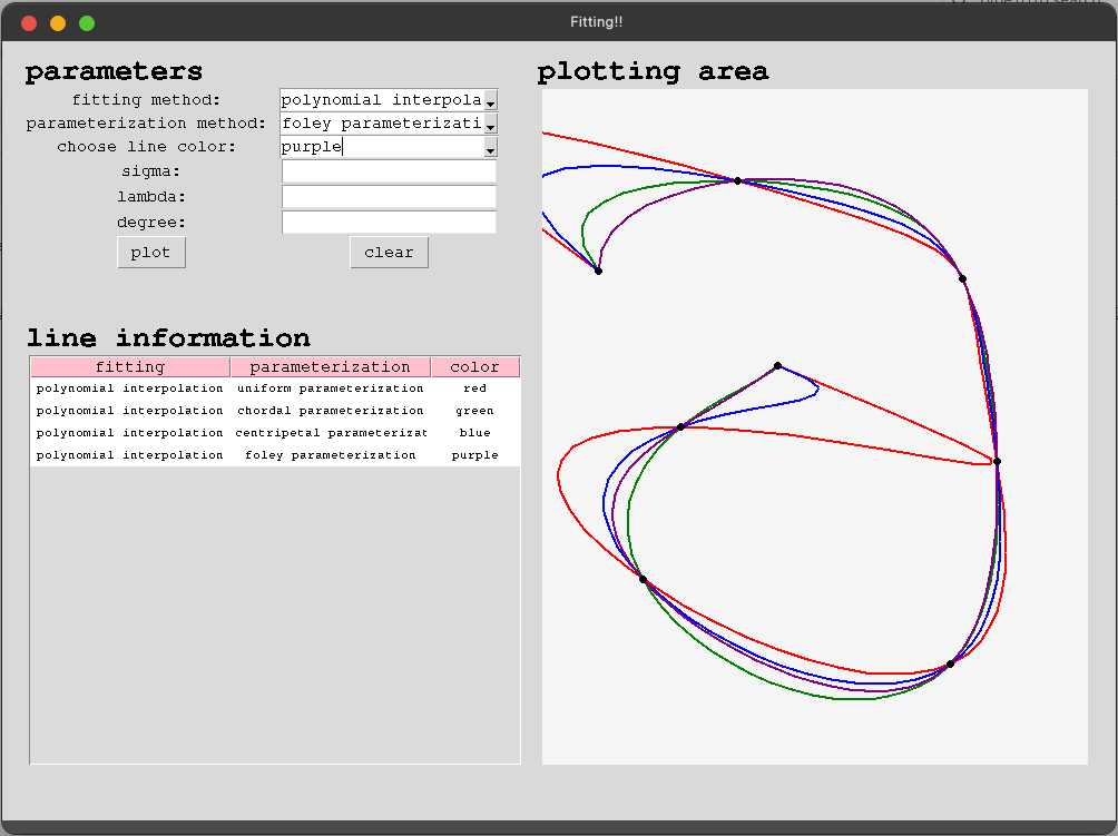 Implement curve fitting and interpolation using five different methods: