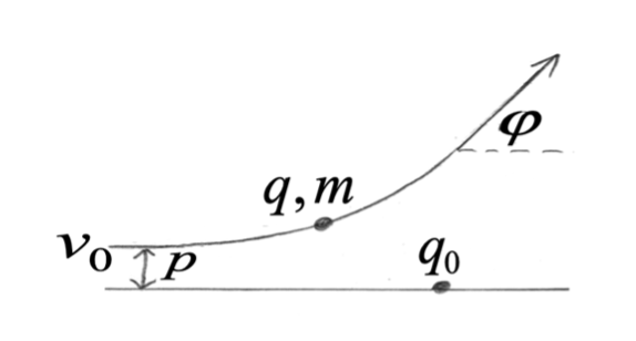 • \(p\) is the impact parameter (the perpendicular distance from the initial trajectory to the center of force),