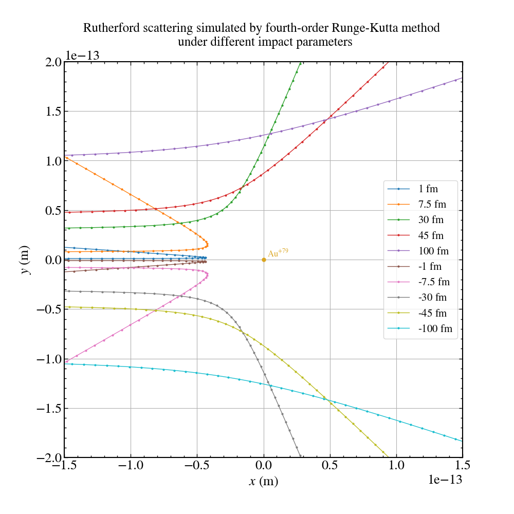 In this project, I recreated the scattering process using a numerical simulation of the Coulomb force between an alpha particle and a gold ion. The simulation is solved using the adaptive Runge-Kutta method, which provides high accuracy when modeling the particle’s trajectory under the influence of electrostatic repulsion.